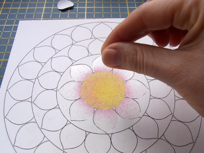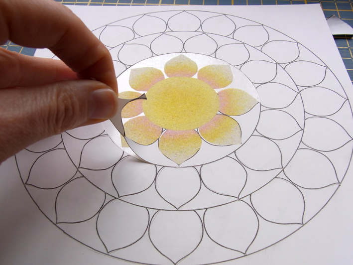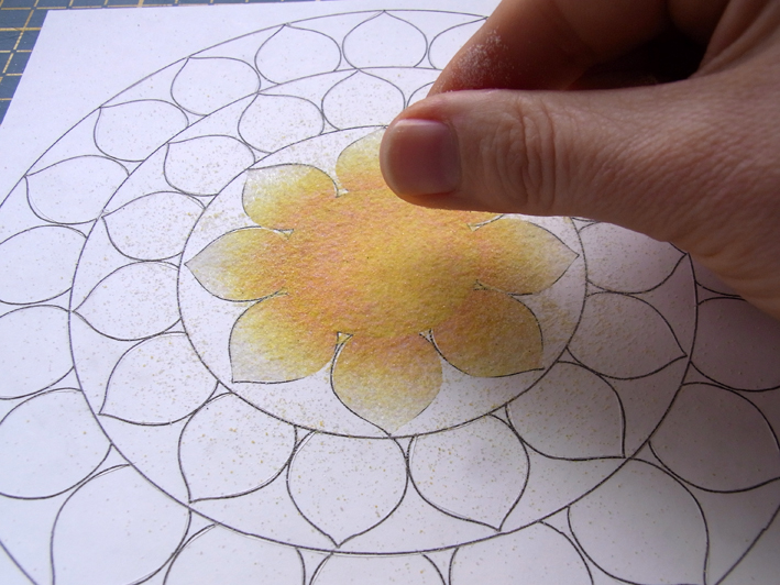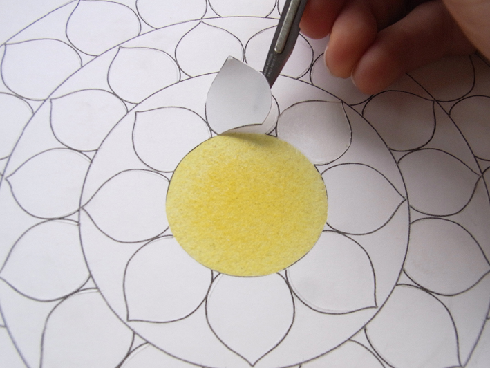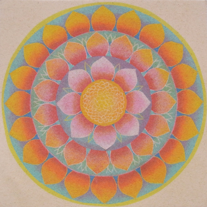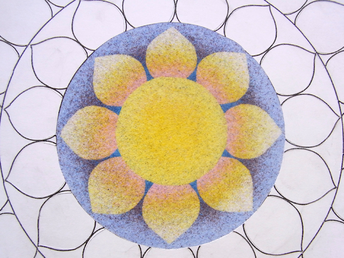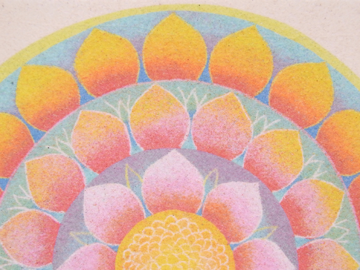 (ty vidíte na fotkách) spotřebujete cca 100 – 150 g písku, na velké festivalové mandaly 1 m x 1 m cca 2 kg.