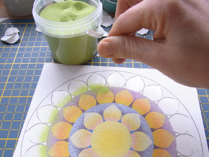 (ty vidíte na fotkách) spotřebujete cca 100 – 150 g písku, na velké festivalové mandaly  1 m x 1 m cca 2 kg.