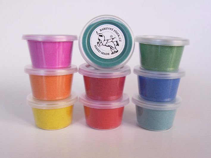 Velmi jemný písek zrnitosti 0,06 – 0,30 mm a zářivých čistých barev po 30 ml (cca 40g).