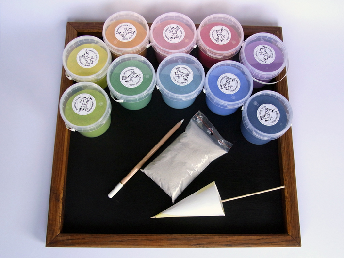 Velká sada obsahuje pískovnici 35 x 35 cm z dubového dřeva s černou tabulovou plochou, 10 barev písku po 200 g balených v zip sáčku, 2 ks sypacích kornoutů se špejlí, bílou křídu.