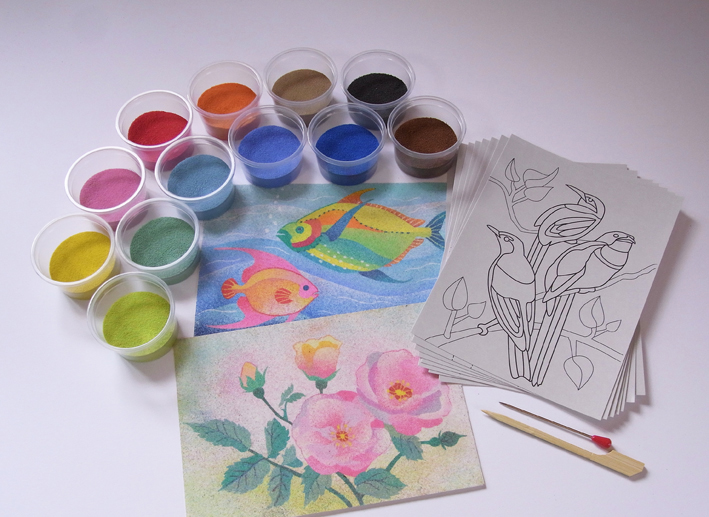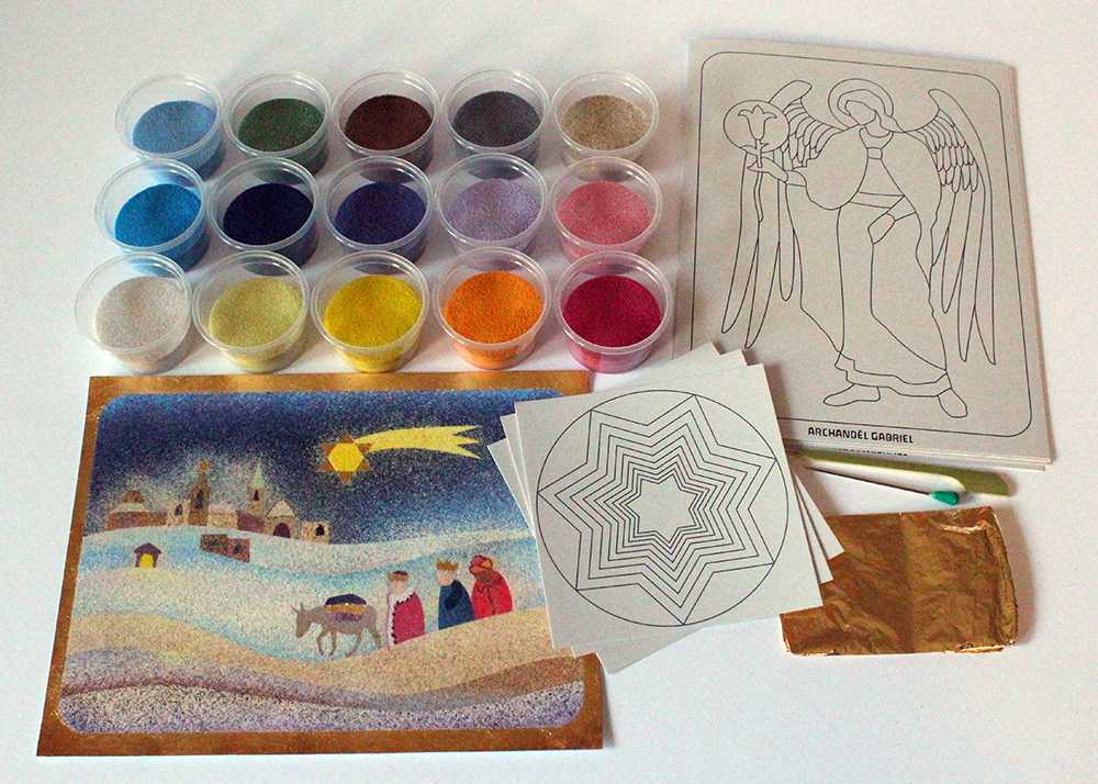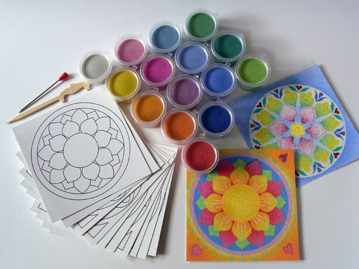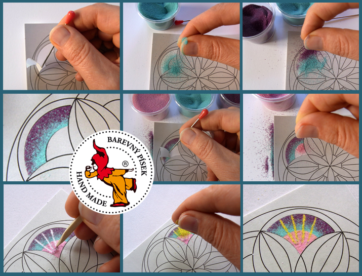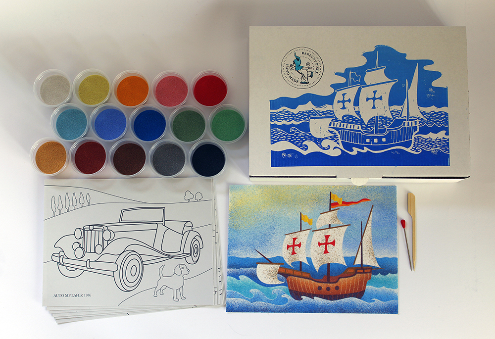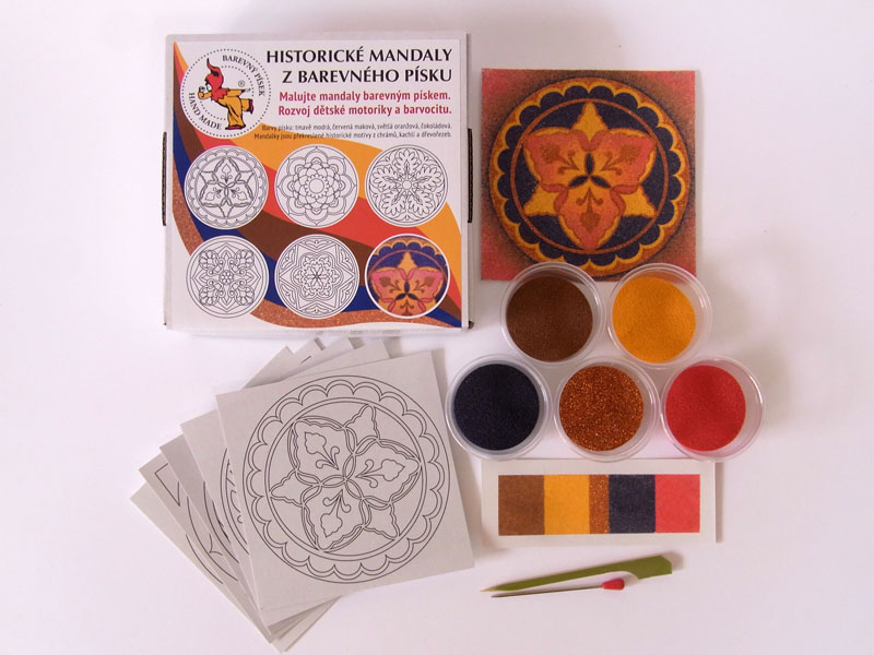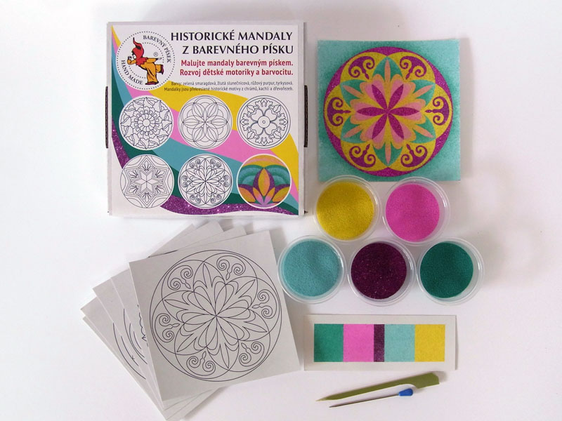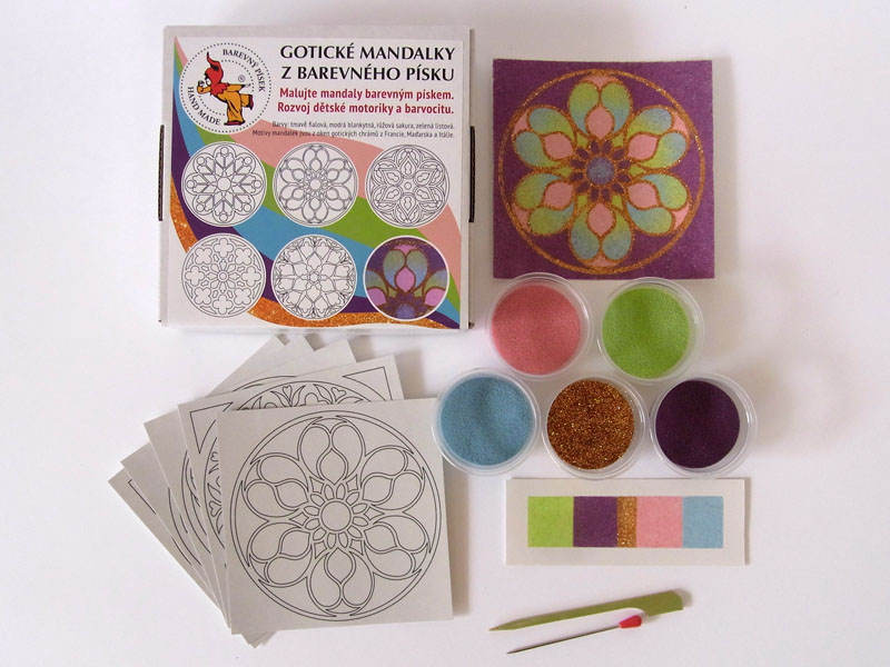 Všechny sady osbahují kelímky s barevným pískem, samolepicí šablony, špendlík a dřívko. V některých je navíc třpytka:-)