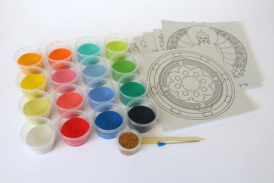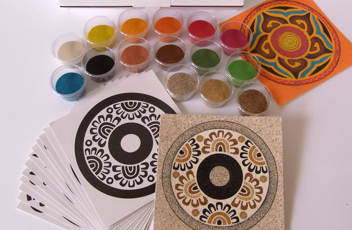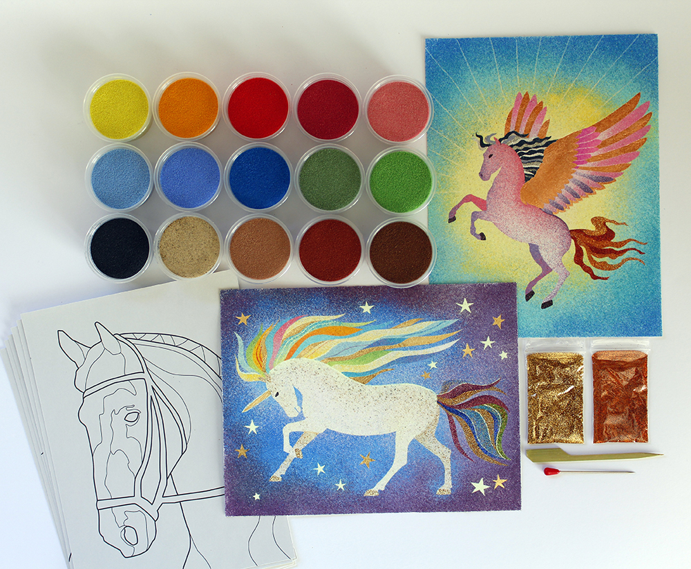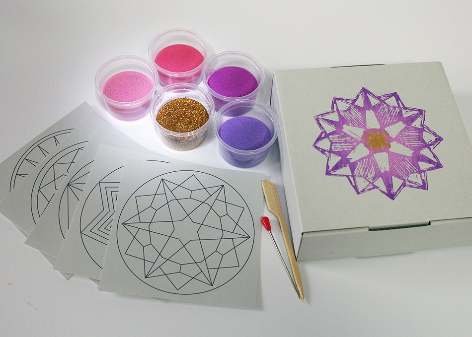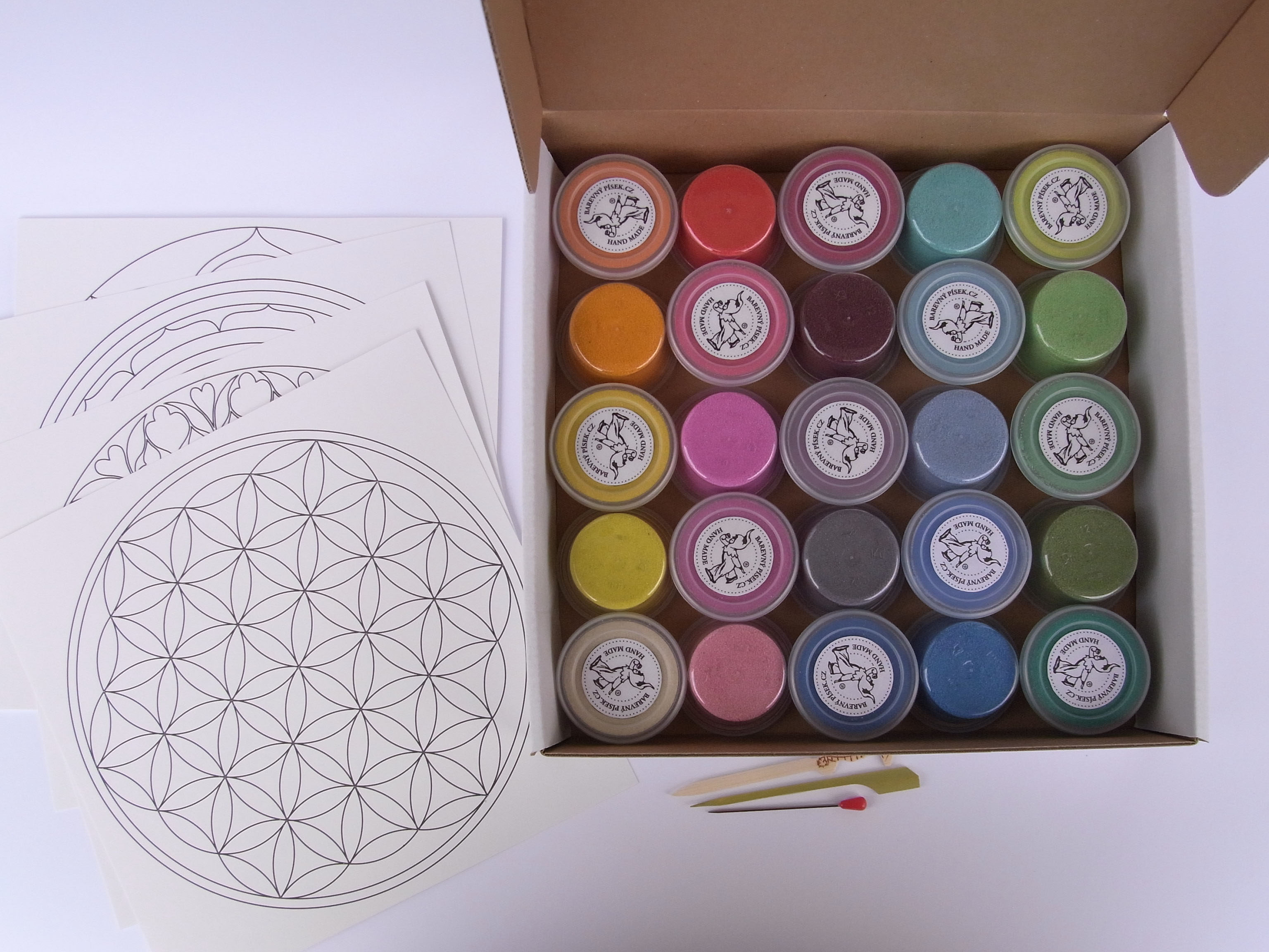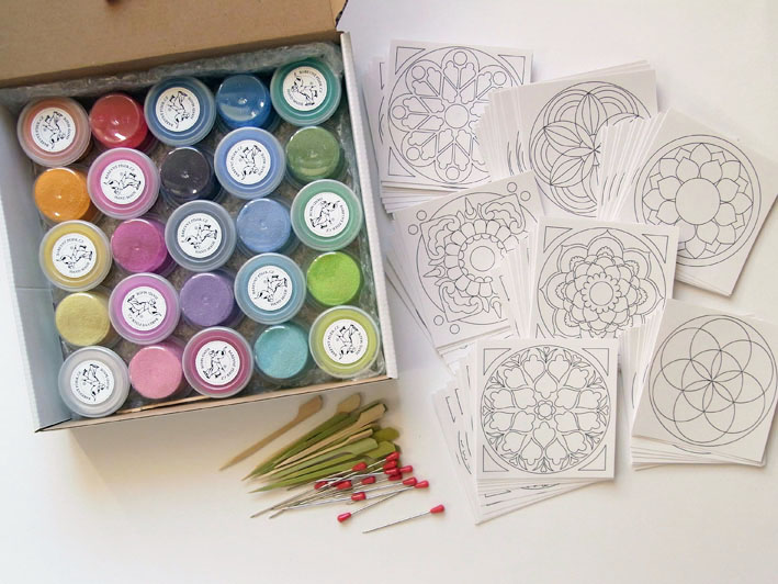 Všechny sady osbahují kelímky s barevným pískem, samolepicí šablony, špendlík a dřívko. V některých je navíc třpytka:-)